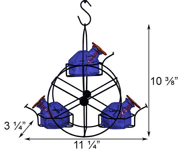 Add fun to bird feeding with the Parasol Ferris Wheel Hummingbird Feeder. This whimsical feeder has circular sides and a black metal frame. Three feeding stations create "chairs", evoking the look of a classic Ferris wheel. A perch attached to each station allows hummingbirds a place to rest and dine, and the three ports enable several birds to feed at once. Each blue Bouquet glass vessel holds 3.5 ounces of nectar for the perfect amount of daily nourishment, and keeps nectar fresh for your hummingbirds. The red, shatterproof plastic feeding flowers mimic trumpet vine to attract more "flying jewels," and perfectly contrast the deep blue reservoirs. As each vessel is hand blown, it retains the individual artisanship of its creator. Use the included 2.25" metal "S" hook to hang this feeder in your garden. Add birding excitement to your yard with the Ferris Wheel Hummingbird Feeder with Blue Vessels.